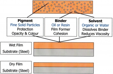 Paints are applied to steel surfaces by many methods but in all cases this produces a 'wet film'. The thickness of the 'wet film' can be measured, before the solvent evaporates, using a comb-gauge. As the solvent evaporates, film formation occurs, leaving the binder and pigments on the surface as a 'dry film'. The thickness of the 'dry film' can be measured, usually with an electro-magnetic induction gauge. The relationship between the applied 'wet film' thickness and the final 'dry film' thicknesses (dft) is determined by the percentage volume solids of the paint, i.e. dft = 'wet film' thickness multiplied by the % vol. solids.